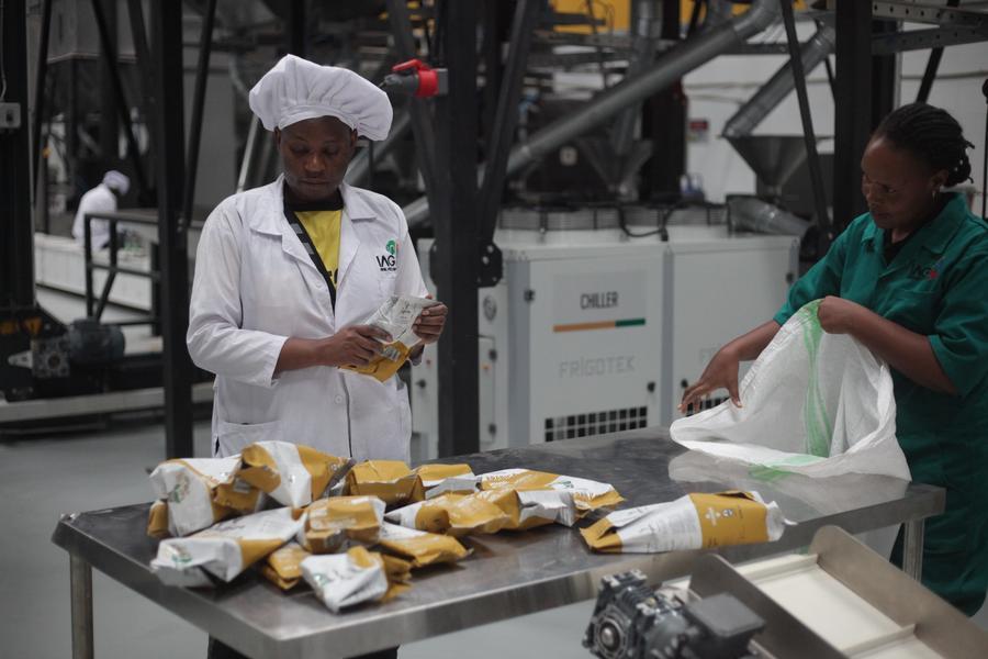Trabalhadoras separam pacotes de café de uma máquina no Parque Africano do Café, no distrito de Ntungamo, oeste de Uganda, em 29 de novembro de 2025. (Foto de Ronald Ssekandi/Xinhua)