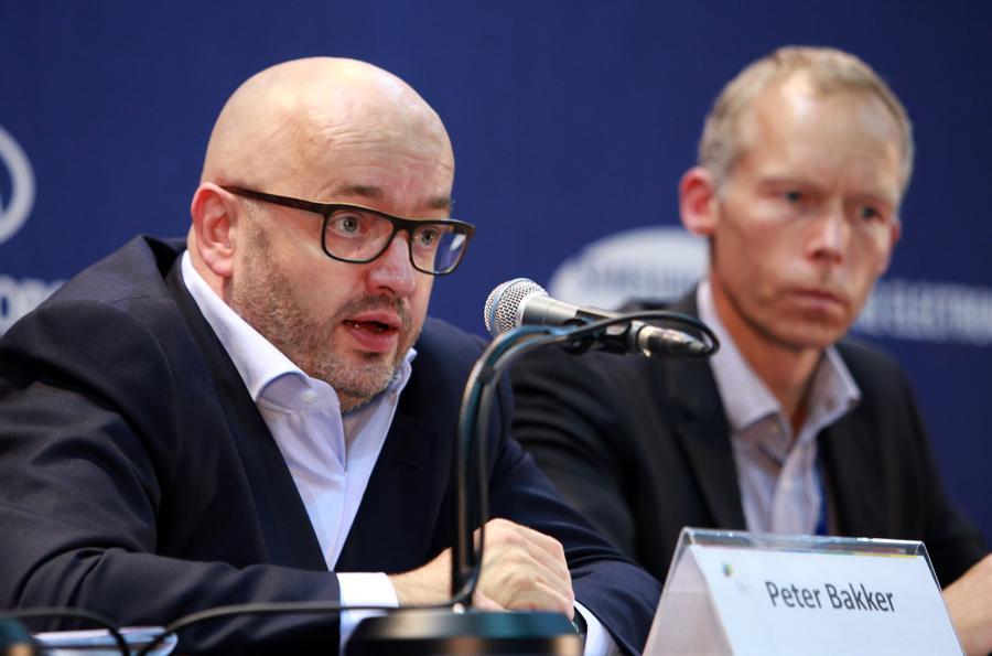 Peter Bakker (esquerda), presidente do Conselho Empresarial Mundial para o Desenvolvimento Sustentável (WBCSD, na sigla em inglês), discursa durante uma coletiva de imprensa no Congresso Mundial de Conservação da União Internacional para a Conservação da Natureza (UICN, na sigla em inglês), em Jeju, Coreia do Sul, em 8 de setembro de 2012. (Xinhua/Park Jin-hee)