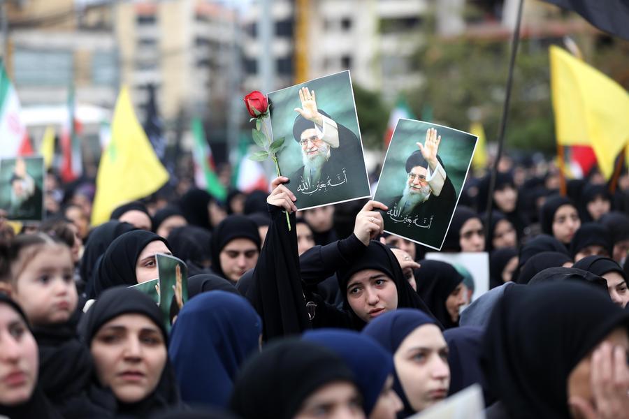 Pessoas se reúnem em solidariedade ao Irã e para protestar contra o assassinato do Líder Supremo do Irã, o Aiatolá Ali Khamenei, nos subúrbios do sul de Beirute, Líbano, em 1º de março de 2026. (Foto de Bilal Jawich/Xinhua)