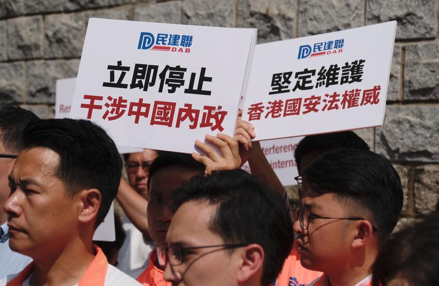 Representantes da Aliança Democrática para o Progresso e o Bem-Estar de Hong Kong (DAB, na sigla em inglês) participam de protesto em frente ao Consulado Geral dos EUA em Hong Kong, sul da China, em 6 de novembro de 2023. (Xinhua/Wang Shen)