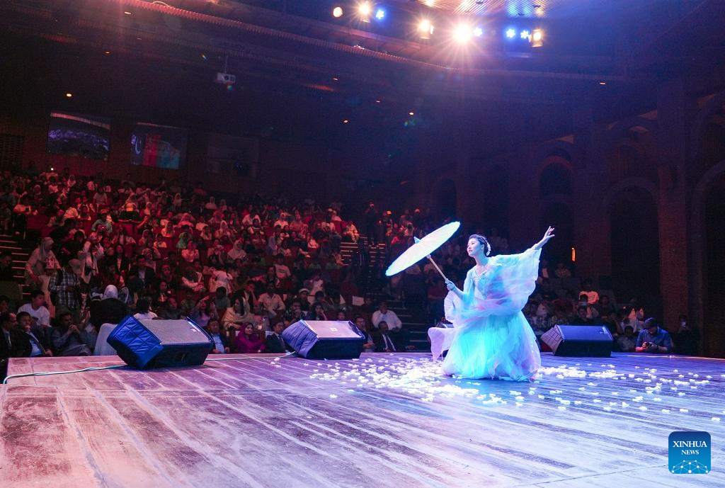 Uma dançarina se apresenta em um evento que marca o 75º aniversário do estabelecimento de relações diplomáticas entre a China e o Paquistão em Islamabad, capital do Paquistão, em 18 de abril de 2025. (Foto de Tang Binhui/Xinhua)