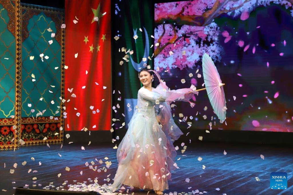 Uma dançarina se apresenta em um evento que marca o 75º aniversário do estabelecimento de relações diplomáticas entre a China e o Paquistão em Islamabad, capital do Paquistão, em 18 de abril de 2025. (Foto de Daniyal Khan Jadoon/Xinhua)