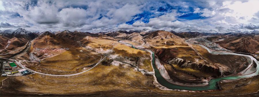 Foto panorâmica aérea tirada por drone em 26 de outubro de 2025 mostra vista do rio Lancang no condado de Zadoi, Prefeitura Autônoma Tibetana de Yushu, província de Qinghai, noroeste da China. (Xinhua/Du Xiaowei)