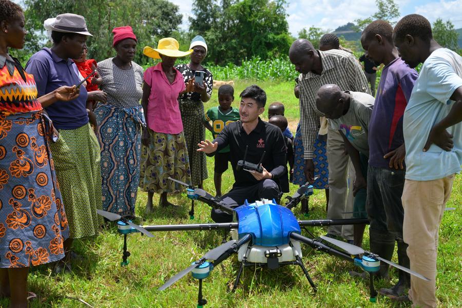 Ma Dengrong (centro), funcionário do 4º grupo de especialistas agrícolas chineses no Zimbábue, mostra drone agrícola a moradores locais na aldeia de demonstração agrícola apoiada pela China em Zindi, distrito de Shamva, província de Mashonaland Central, Zimbábue, em 26 de janeiro de 2026. (Xinhua/Yang Guang)