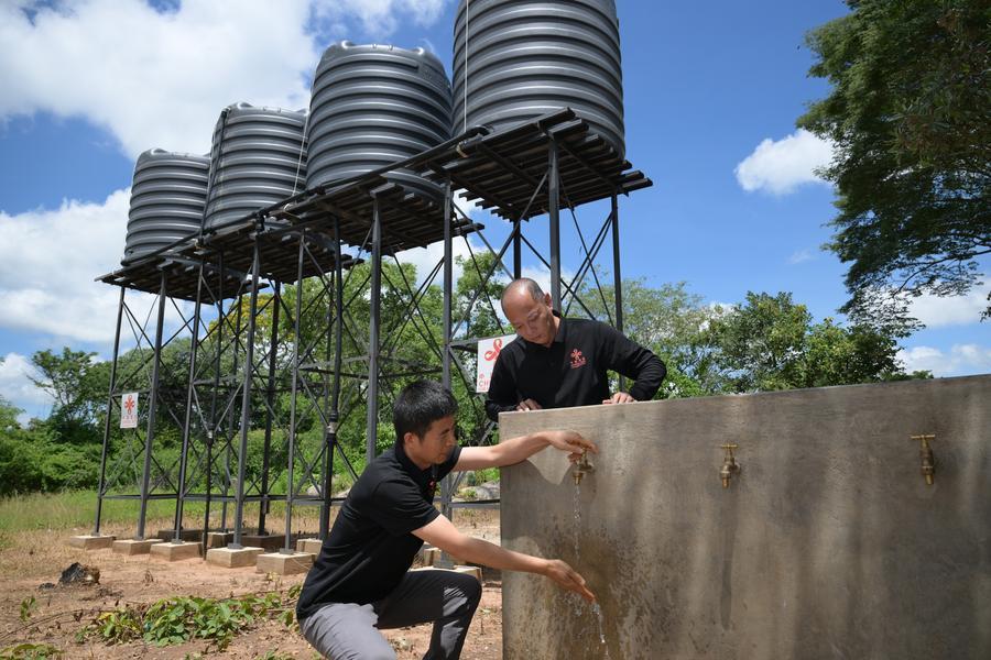 Funcionários do 4º grupo de especialistas agrícolas chineses no Zimbábue verificam torneira próxima a uma torre de armazenamento de água na aldeia de demonstração agrícola apoiada pela China em Zindi, distrito de Shamva, província de Mashonaland Central, Zimbábue, em 26 de janeiro de 2026. (Xinhua/Yang Guang)