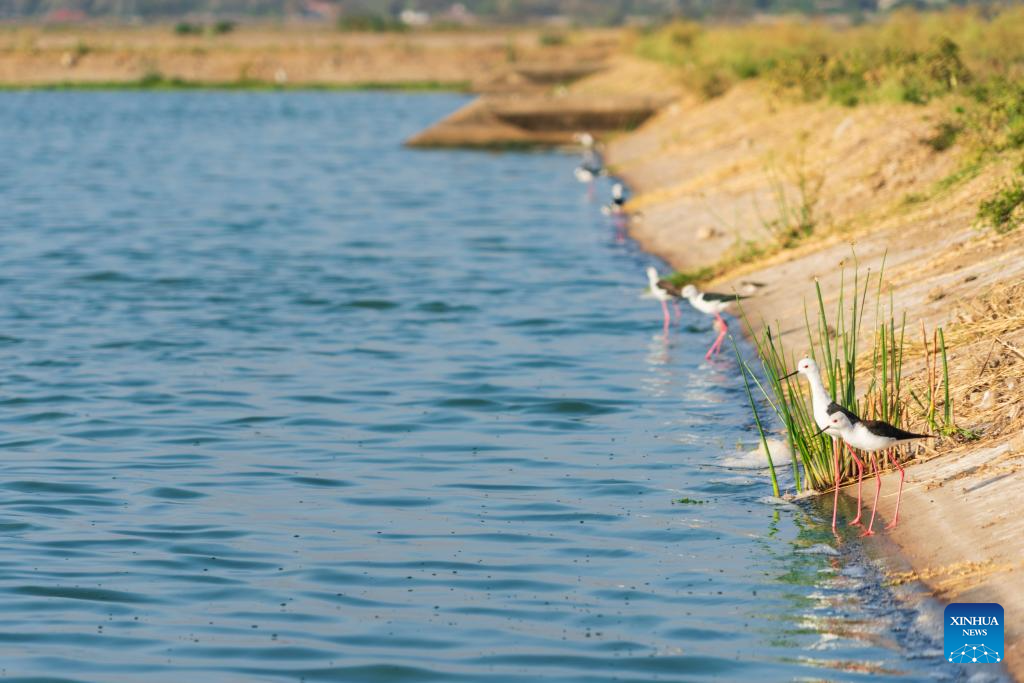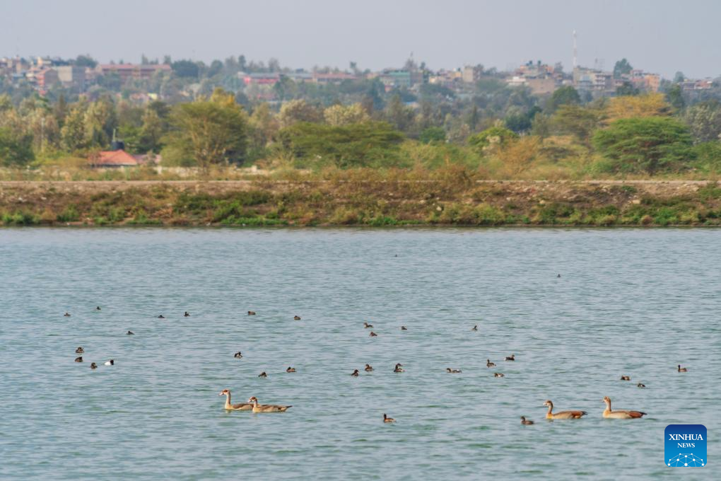 Pássaros na lagoa de tratamento de esgoto da Estação de Tratamento de Esgoto de Dandora Estate, em Nairóbi, Quênia, em 6 de fevereiro de 2026. (Xinhua/Xie Jianfei)