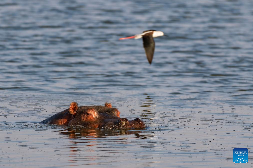 Hipopótamo na lagoa de tratamento de esgoto da Estação de Tratamento de Esgoto de Dandora Estate, em Nairóbi, Quênia, em 6 de fevereiro de 2026. (Xinhua/Xie Jianfei)