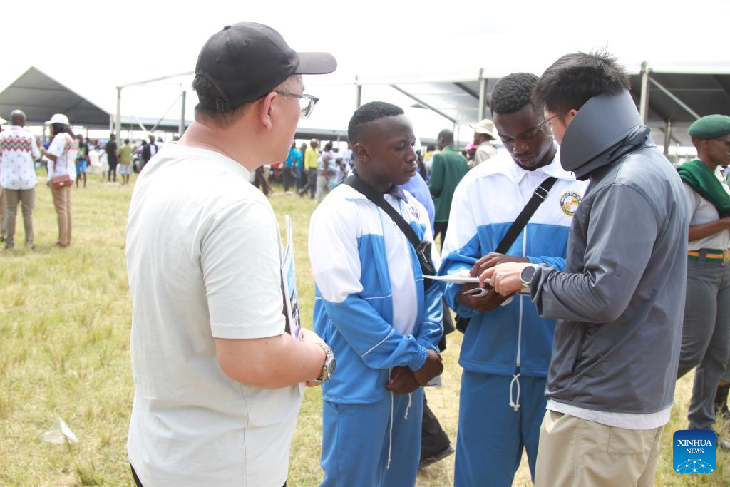 Jovens zimbabuanos perguntam sobre oportunidades de emprego a funcionários de uma empresa chinesa durante uma feira de empregos no distrito de Marondera, província de Mashonaland Leste, Zimbábue, em 21 de fevereiro de 2026. Como o mercado de trabalho continua competitivo para recém-formados, jovens zimbabuanos têm demonstrado crescente interesse em buscar oportunidades de carreira em empresas chinesas, que se tornaram uma importante fonte de emprego no país da África Austral. (Foto de Tafara Mugwara/Xinhua)