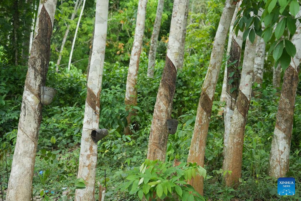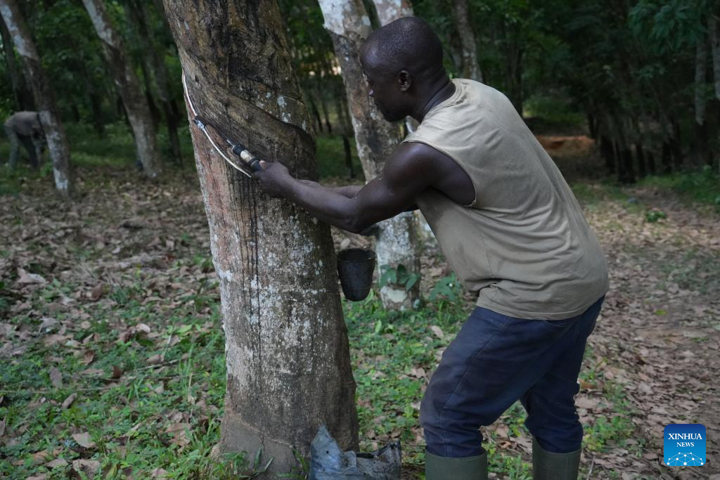 Abidjan, 21 abr (Xinhua) -- Uma leve névoa paira sobre as plantações de seringueiras no sul da Costa do Marfim no início da manhã, enquanto trabalhadores extraem látex das árvores, que escorre lentamente pelos troncos.