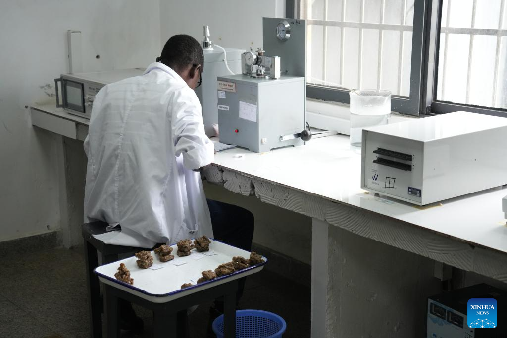 Um técnico de laboratório faz testes de qualidade em produtos de borracha em uma fábrica de processamento de borracha do Grupo Mainland da China em San Pedro, Costa do Marfim, em 9 de abril de 2026. (Xinhua/Zhang Jian)