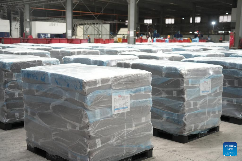 Blocos de borracha padronizados e embalados organizados cuidadosamente em um armazém em uma fábrica de processamento de borracha do Grupo Mainland da China em San Pedro, Costa do Marfim, em 9 de abril de 2026. (Xinhua/Zhang Jian)