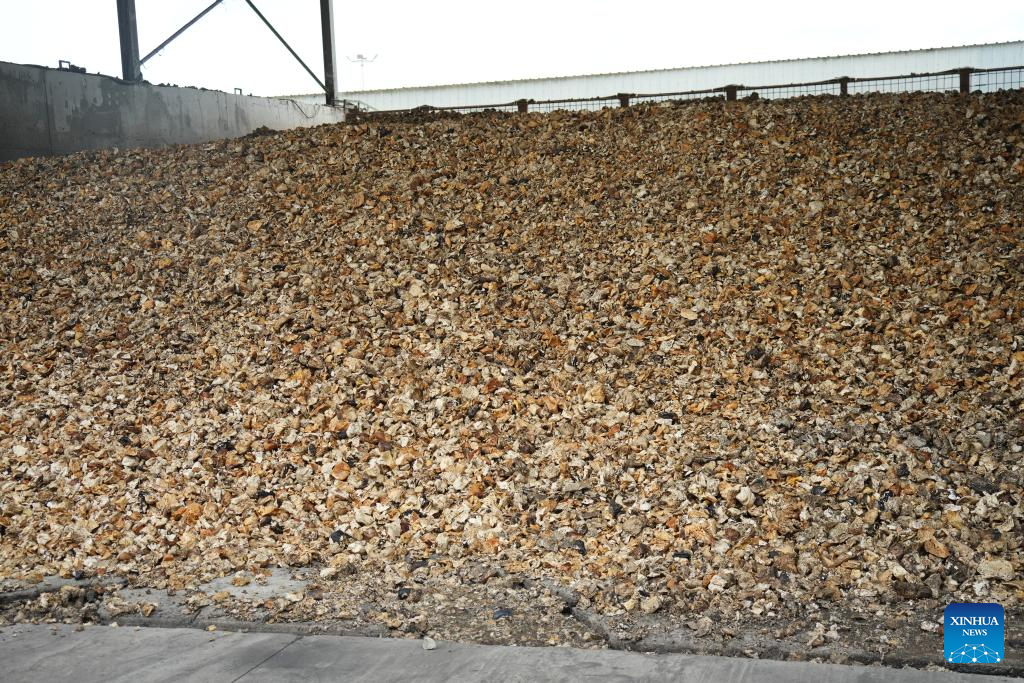 Materiais de borracha pré-processados ​​são transportados por elevador de baldes para a etapa de crepagem e desidratação em uma fábrica de processamento de borracha do Grupo Mainland da China em San Pedro, Costa do Marfim, em 9 de abril de 2026. (Xinhua/Zhang Jian)