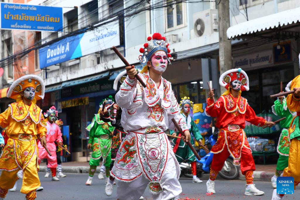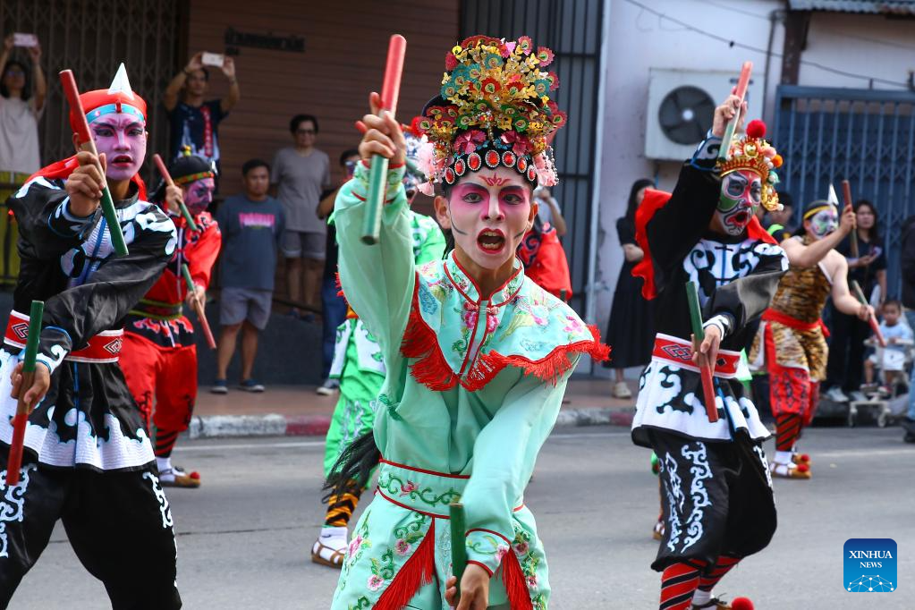 Pessoas dançam Yingge no distrito de Phanat Nikhom, província de Chonburi, Tailândia, em 28 de fevereiro de 2026. (Xinhua/Sun Weitong)