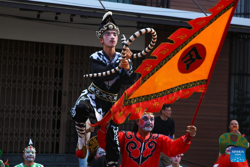 Integrantes da Equipe Nigou de Yingge de Puning, província de Guangdong, China, se apresentam no distrito de Phanat Nikhom, província de Chonburi, Tailândia, em 28 de fevereiro de 2026. (Xinhua/Sun Weitong)