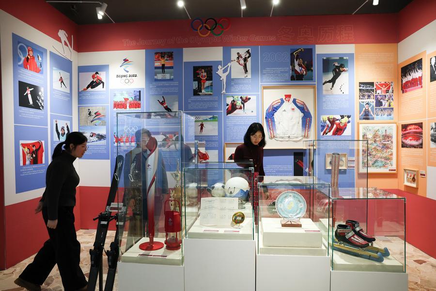 Foto tirada em 4 de fevereiro mostra área de exposição sobre a história da participação da China nos Jogos Olímpicos de Inverno. (Xinhua/Li Jing)