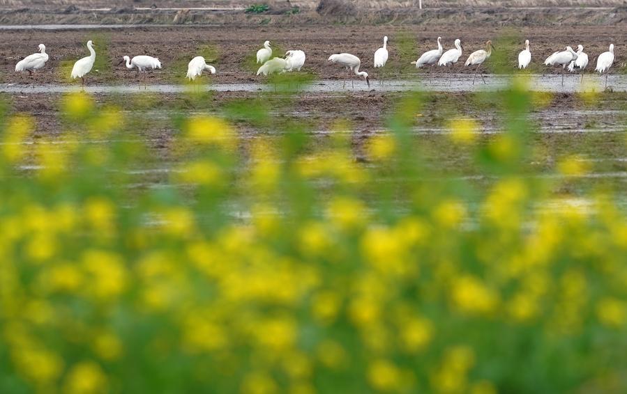 Foto tirada em 27 de fevereiro de 2026 mostra aves migratórias se alimentando no condado de Yugan, província de Jiangxi, no leste da China. O Lago Poyang, o maior lago de água doce da China e uma extensa área úmida, é um importante local de inverno e parada ao longo da Rota Migratória da Ásia Oriental-Australásia. (Xinhua/Wan Xiang)