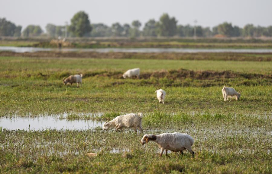Foto tirada em 20 de setembro de 2025 mostra ovelhas pastando em uma área úmida do Rio Tarim, no Condado de Yuli, Prefeitura Autônoma Mongol de Bayingolin, Região Autônoma Uigur de Xinjiang, noroeste da China. (Xinhua/Jiang Wenyao)