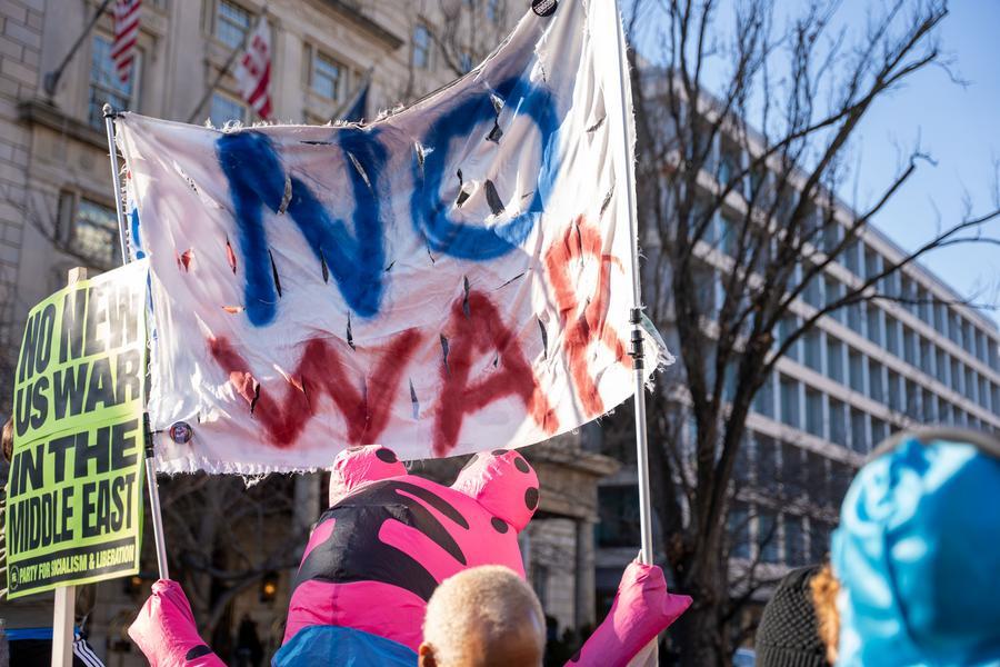 Pessoas participam de um protesto contra os ataques dos EUA e de Israel ao Irã, em Washington, D.C., Estados Unidos, em 7 de março de 2026. (Foto de Li Yuanqing/Xinhua)