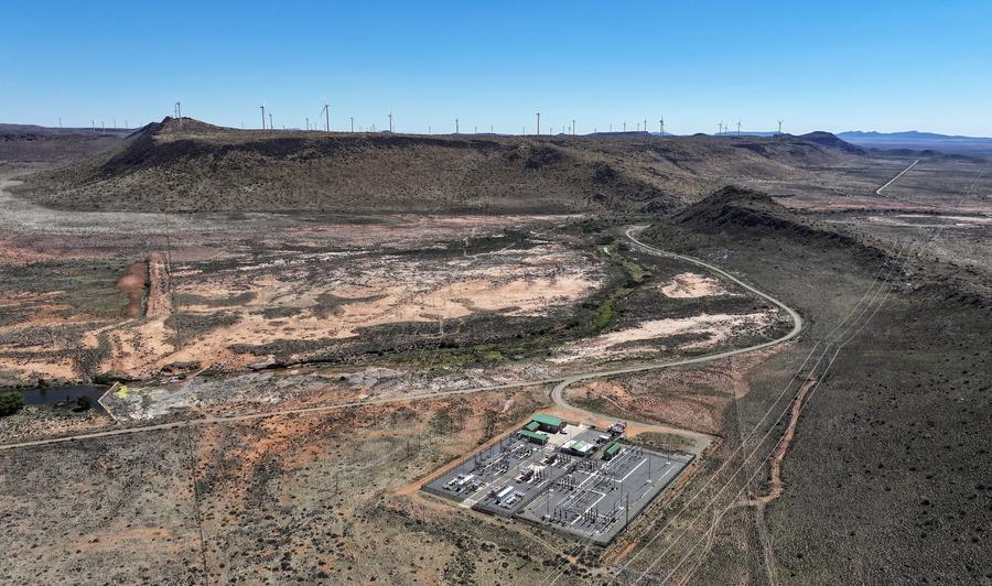 Foto aérea tirada em 22 de outubro de 2025 mostra subestação e turbinas eólicas do Projeto de Energia Eólica de De Aar, em De Aar, Cabo Setentrional, África do Sul. (Xinhua/Han Xu)
