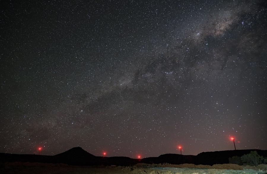 Luzes de sinalização em turbinas eólicas do Projeto de Energia Eólica de De Aar são vistas sob o céu estrelado em De Aar, Cabo Setentrional, África do Sul, em 22 de outubro de 2025. (Xinhua/Han Xu)