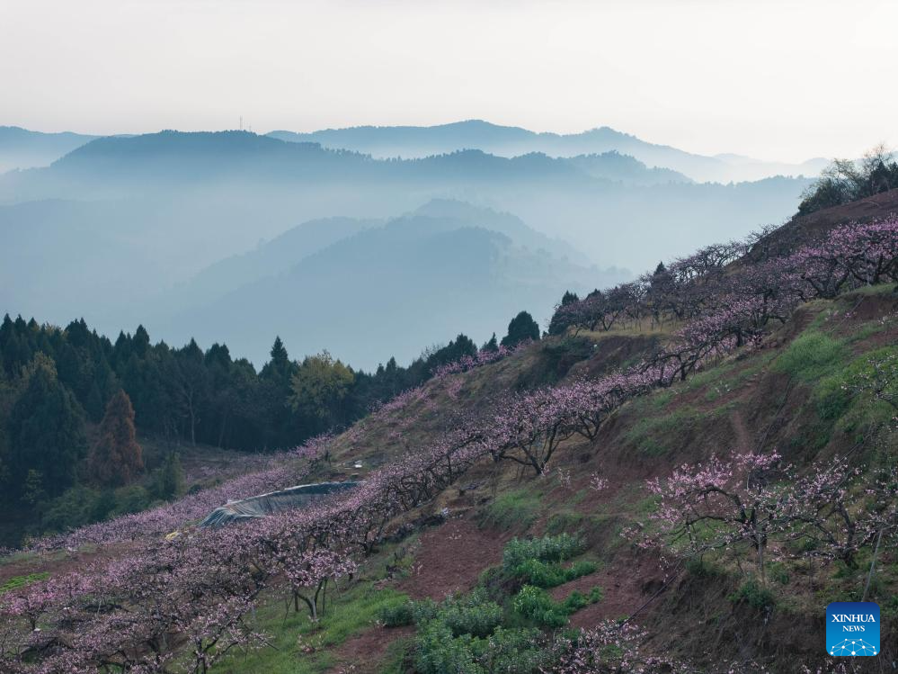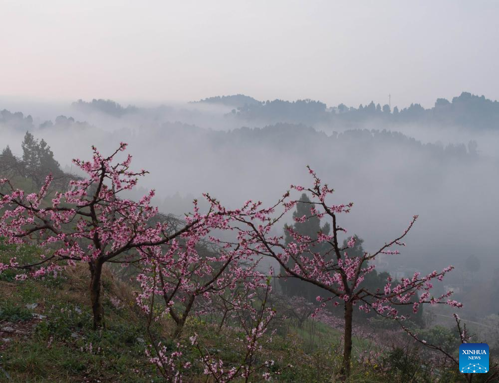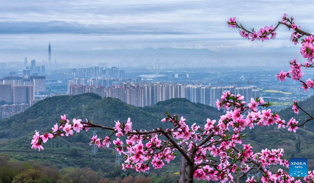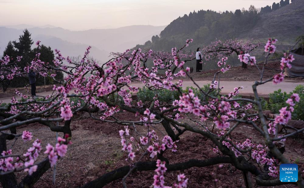 Pessegueiros floridos encantam visitantes em Chengdu, na Província de Sichuan