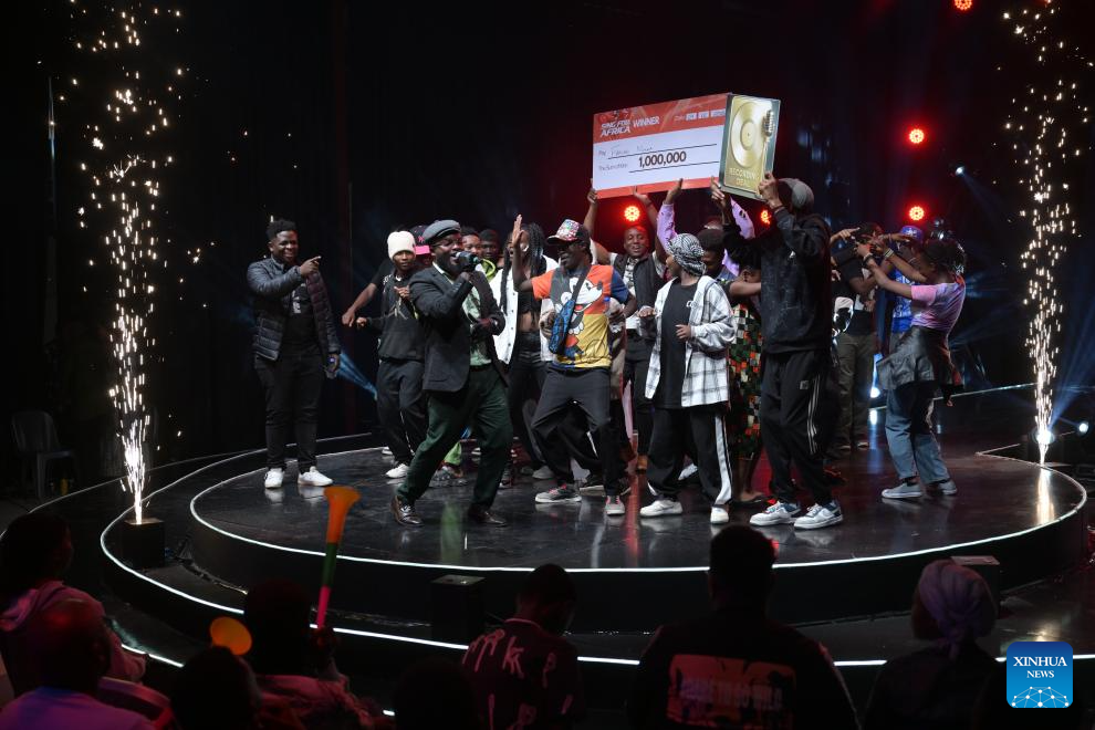 Fanuel Mulwa (frente) comemora com outros após vencer o Sing for Africa, um concurso de talentos musicais apoiado pela China, em Nairóbi, Quênia, em 30 de dezembro de 2025. (Xinhua/Xie Jianfei)