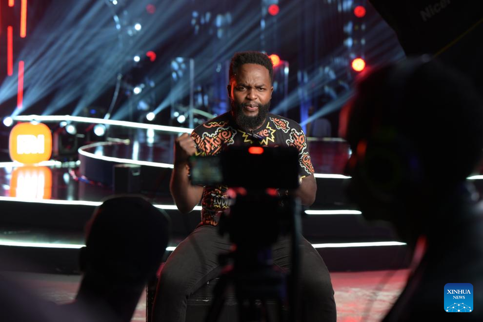 Fanuel Mulwa dá entrevista na final do Sing for Africa, um concurso de talentos musicais apoiado pela China, em Nairóbi, Quênia, em 29 de dezembro de 2025. (Xinhua/Xie Jianfei)