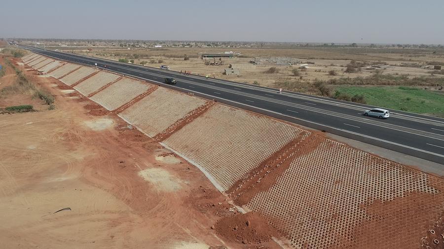 Foto aérea de drone tirada em 17 de março de 2024 mostra trabalho de proteção de taludes do projeto da rodovia Mbour-Kaolack, no Senegal. (China Road and Bridge Corporation/Divulgação via Xinhua)