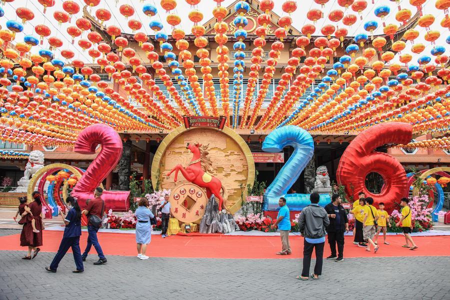 Pessoas caminham em frente a uma instalação de Ano Novo Chinês em Medan, Sumatra do Norte, Indonésia, em 17 de fevereiro de 2026. (Foto de Alberth Damanik/Xinhua)